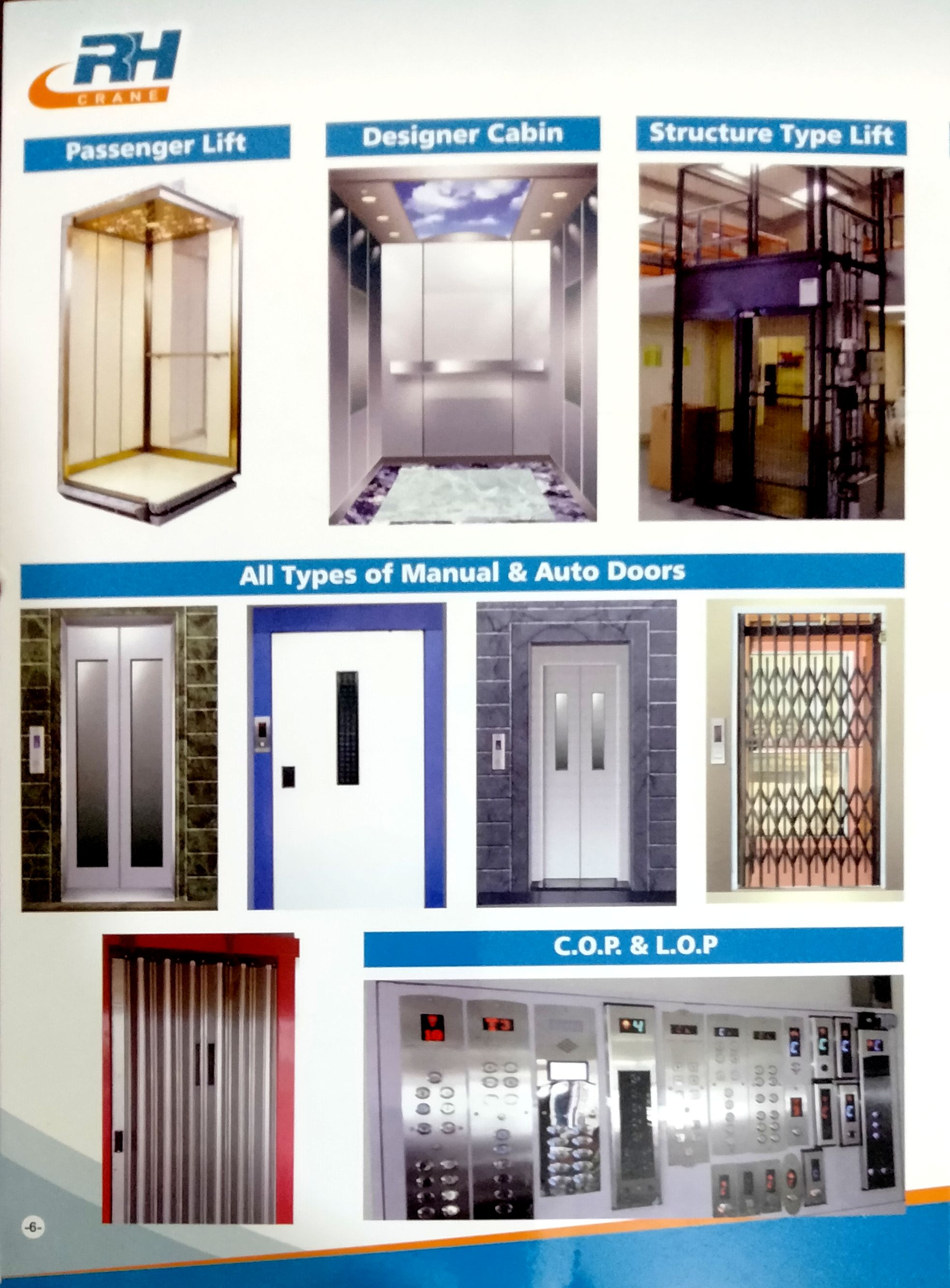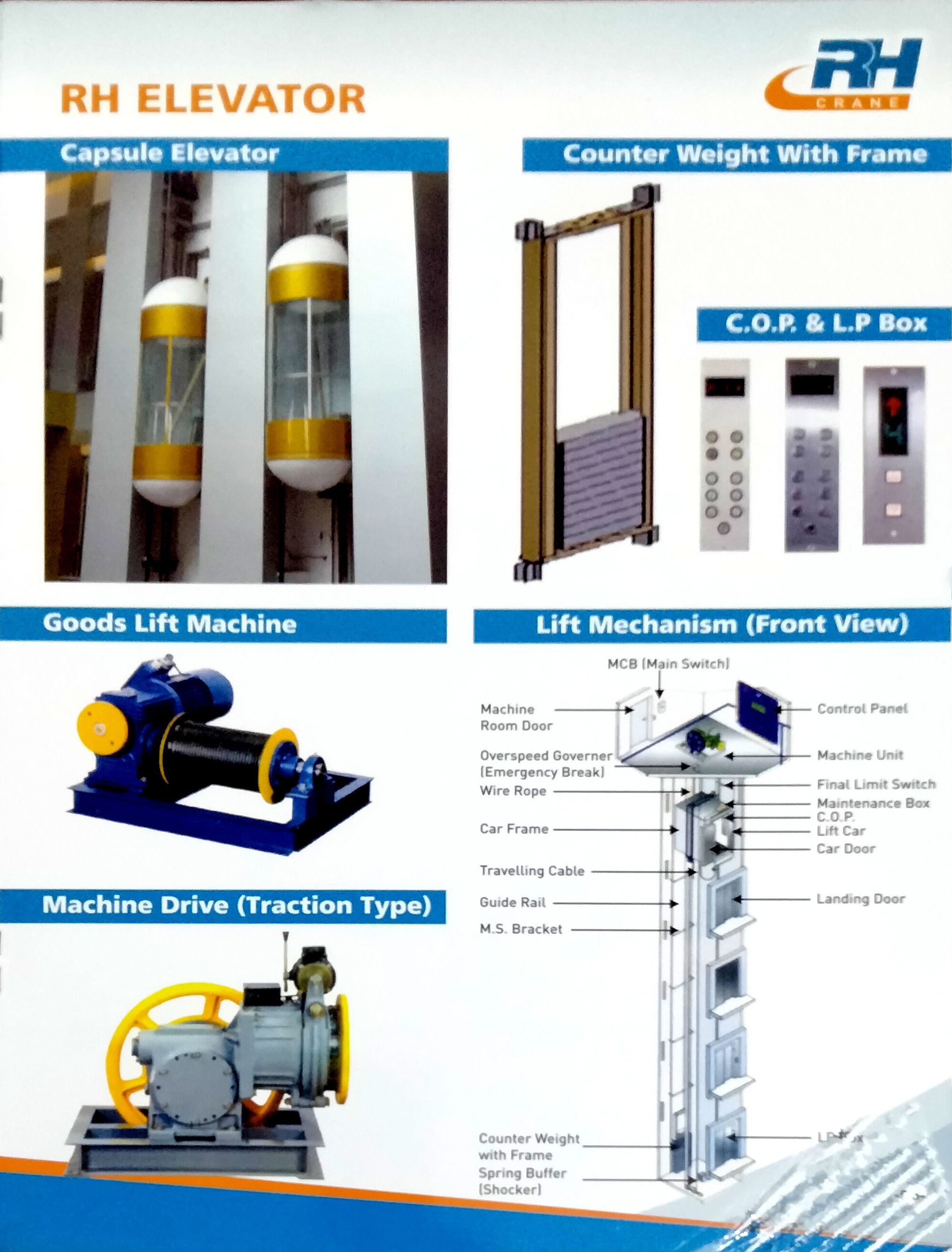 R.H. Crane Ludhiana is manufacturing EOT Cranes, Single Girder Crane, Double Girder Crane, JIB Crane, Lifting Stacker, Pallet Truck, Electric Wire Rope Hoists, Hydraulic Lift, Elevator and Lifts, Crane spare parts, Lift Spare Parts, Goods Lifts, Passenger Lifts, Home Lifts, Commercial Lifts, Hospital Elevators, Car lifts, Capsule Lifts, Escalators lifts, Hydraulic lifting Table, Hydraulic Pallet Truck, Hydraulic Mobile Floor Crane, Hydraulic Stackers and Other Customized Material Handling Equipments & Spares Parts etc.